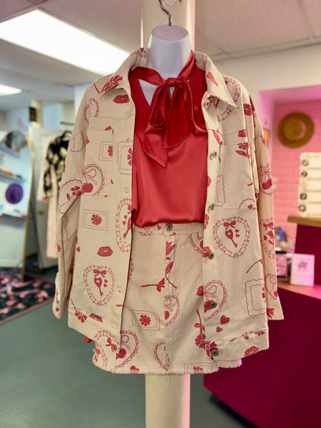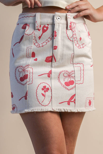 **MATCHING Shacket sold SEPARATELY** - Back Elastic Graphic Mini Skirt - Front Button & Zipper - Side Pockets - Frayed Hem | Model height: 5"9", wearing a Small