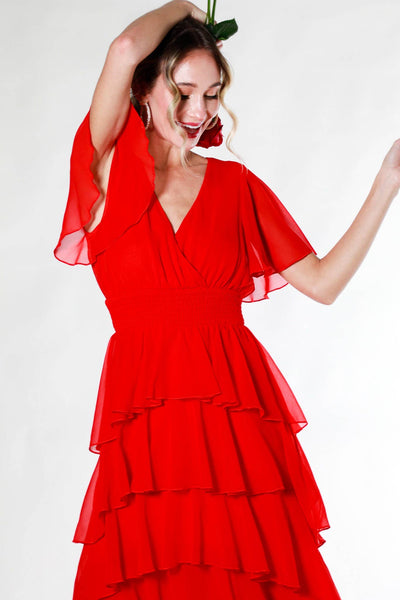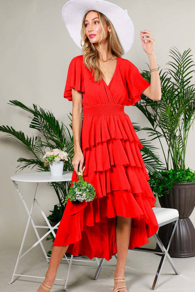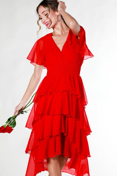 - Surplice neckline - Ruffled Short Sleeve - Ruffle four Layered Chiffon Midi Dress - Elasticized Smocked Waist - Fully lined bodice and skirt - Unlined sleeve - High and Low - Stunning dress for any special occasion - Holiday, Valentine's Day, Vacation *